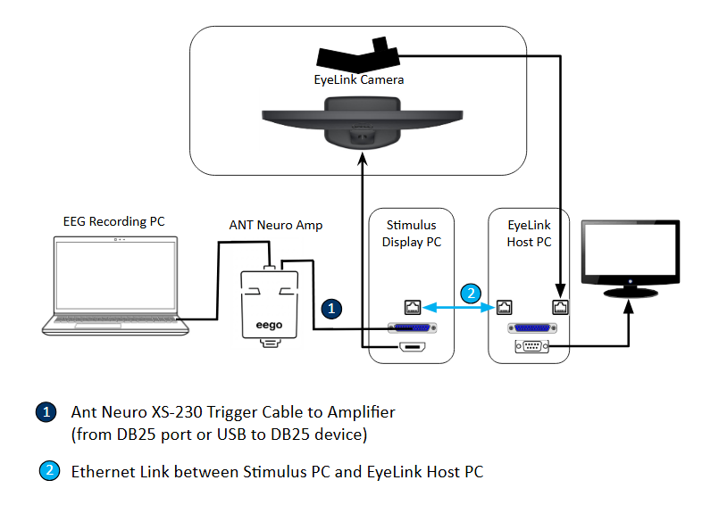 - During task performance, the stimulus presentation software (e.g., Experiment Builder, PsychoPy, E-Prime, Presentation, PsychToolBox, etc.) simultaneously sends TTLs signals to the ANT Neuro device via a parallel port / trigger cable and messages to the EyeLink Host PC via the ethernet link.